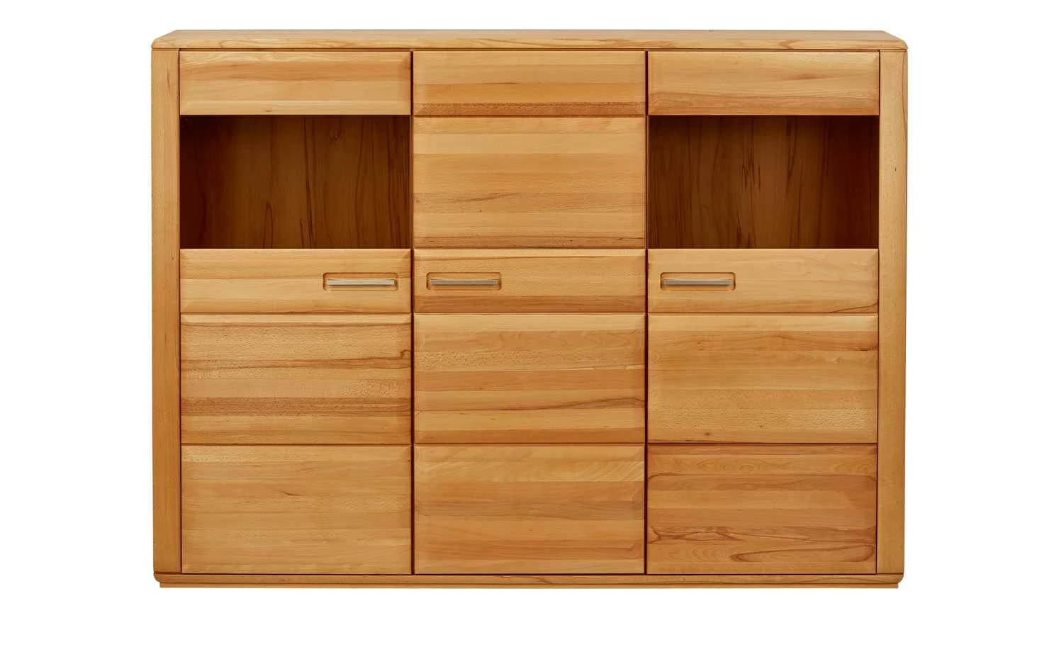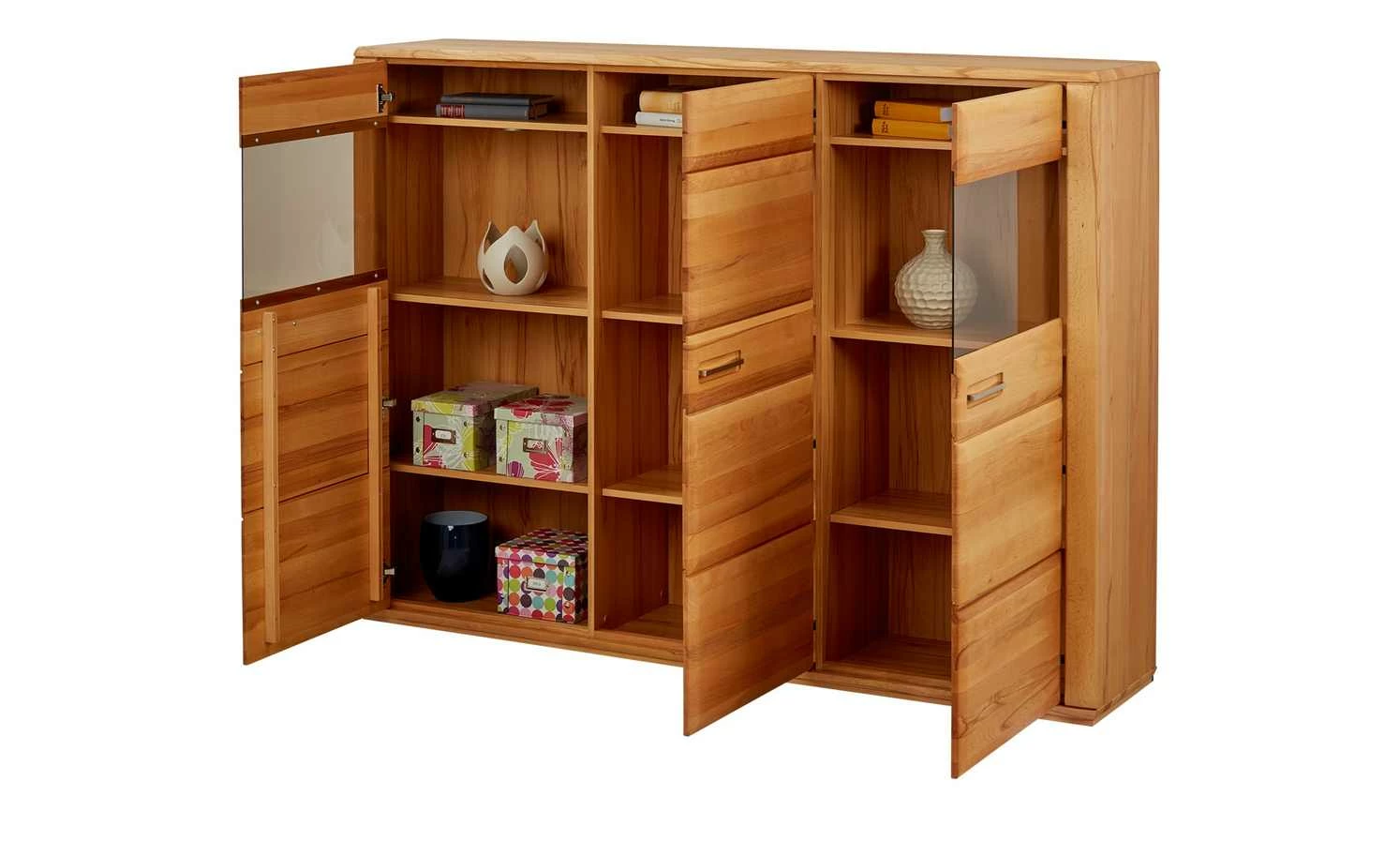 Durch die Unterteilung des Stauraums im Inneren ist das Highboard Dio besonders praktisch. So können Sie all die Dinge, die Sie aufbewahren möchten, ordentlich sortieren. Dank der drei Türen ist der Inhalt der Fächer vor Staub geschützt. Die beiden äußeren Türen sind mit bräunlichem Parsolglas abgesetzt. Durch dieses haben Sie einen freien Blick in den Inhalt der dahinter liegenden Fächer. Ideal um dort Lieblingsdeko oder hübsches Geschirr zu platzieren. Die Türen sind alle aus massivem Holz. Der Korpus ist hingegen mit einem hochwertigen Furnier versehen worden.