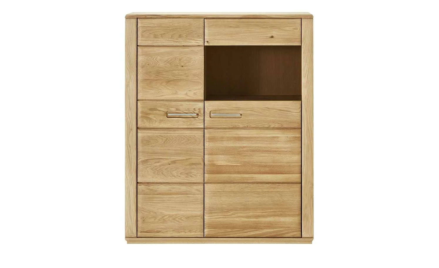 Viel Platz für Geschirr, Gläser und Tischwäsche bietet Ihnen das Kombi-Highboard Dio. Hinter den beiden Drehtüren stehen Ihnen insgesamt acht Fächer zur Verfügung. Durch den Glasausschnitt in der Tür haben Sie einen freien Blick in eines der Fächer. Ideal um dort besonders edle Lieblingsstücke in Szene zu setzen. Die Front des Kombi-Highboards besteht aus stabilem Massivholz. Der Korpus ist hochwertig furniert.