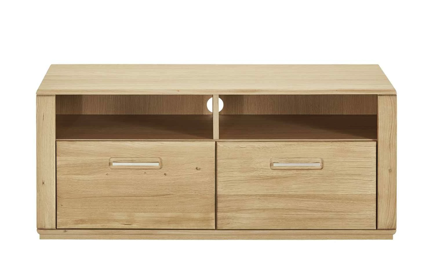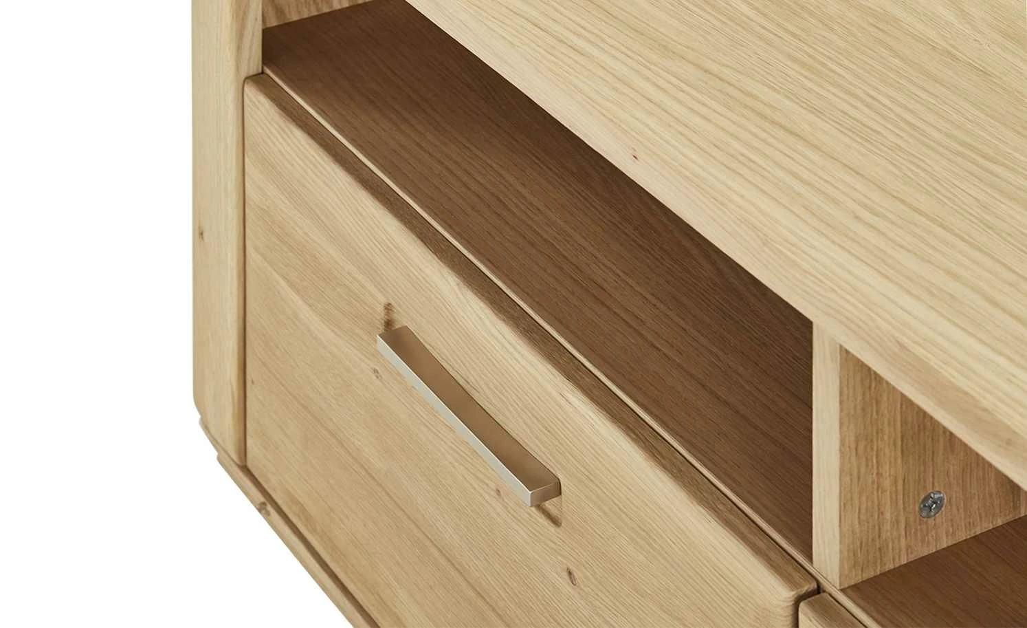 Fernseher, Blu-Ray-Player und Festplattenrecorder sind auf und im TV-Element Dio gut aufgehoben. Die beiden offenen Gerätefächer sind mit Kabelöffnungen in der Rückwand ausgestattet. Direkt unter den offenen Fächern ist Dio außerdem mit zwei Schubladen ausgestattet. Während der Korpus hochwertig furniert ist, besteht die Front aus edlem Massivholz. Die Oberfläche ist zum Schutz des Holzes geölt worden.