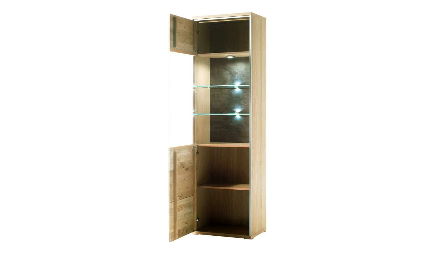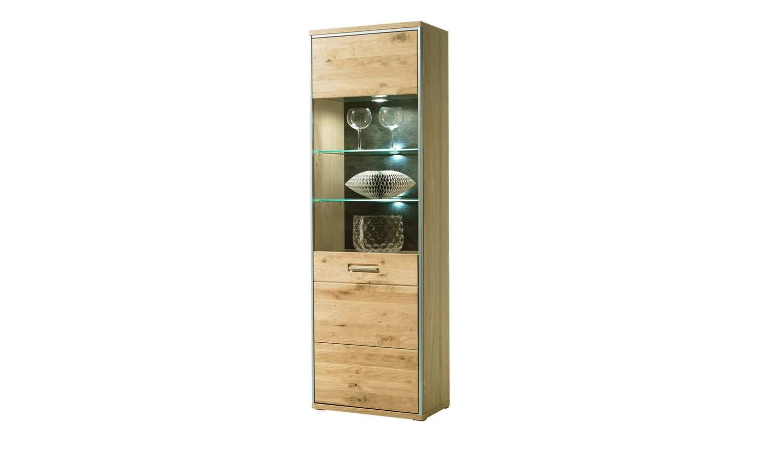 - Mehr zum Material: Tür mit Klarglas, Absetzung Metall in Edelstahloptik, Sichtbare Rückwand: Schiefer (Nachbildung), Metallgriffe eingefräst in Edelstahloptik, Front in Ast-Eiche Bianco Massiv, Korpus Außen in Eiche Bianco Furnier und Innen in Eiche Bianco Nachbildung